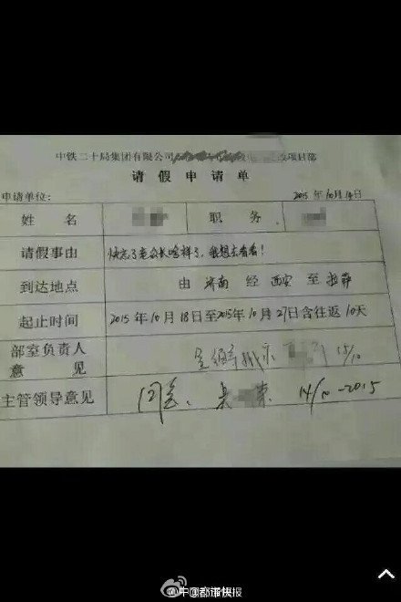 从假条的抬头“中铁20局集团有限公司”来看,这应该是一对长期分在两个项目的一线工地夫妻……