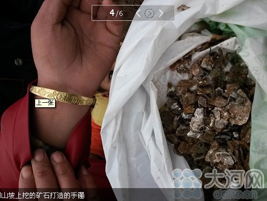 本台消息,2014年春节期间,在南阳市安皋镇北的数个村庄,村民在串亲访友之余经常三五成群在山坡上挖挖铲铲,村民称挖的是低含量的“黄金”,还能打镯子、戒指、项链等等,附近村上很多人都戴着打制的“金”饰品。此消息一传出引起了各个媒体及网友的关注,村民疯挖的为何物?到底有没有价值?